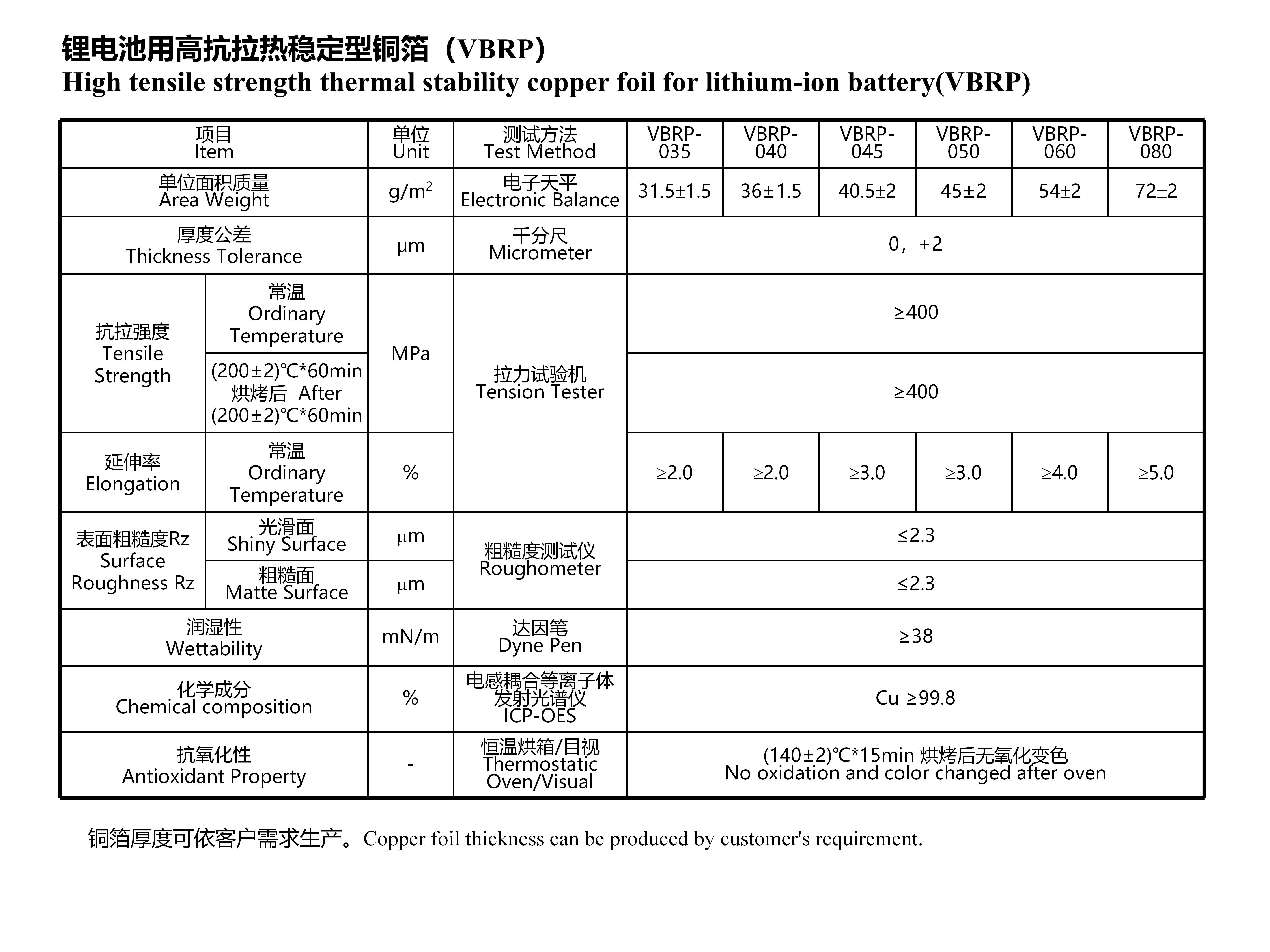 鋰電池用高抗拉熱穩(wěn)定型銅箔(VBRP)